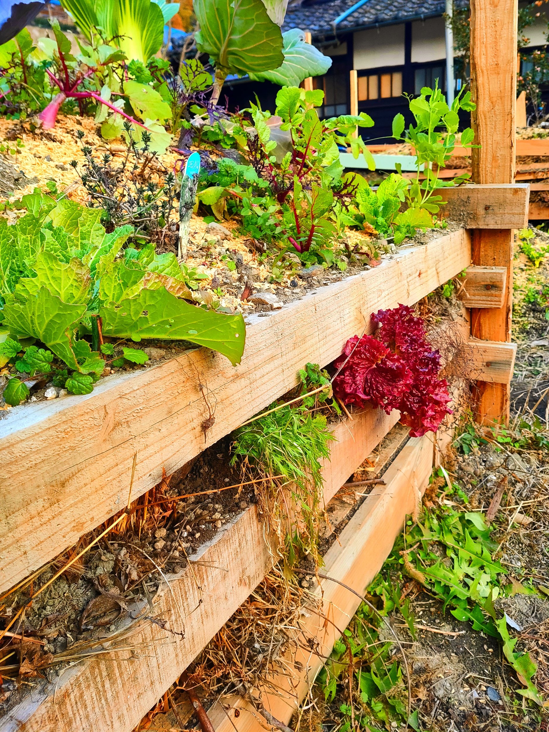 なので、冬は同じベッドを廃材でつくったレイズドベッド raised bed にバージョンアップし、秋口に植えた苗も年末にはゆっくりしっかり成長