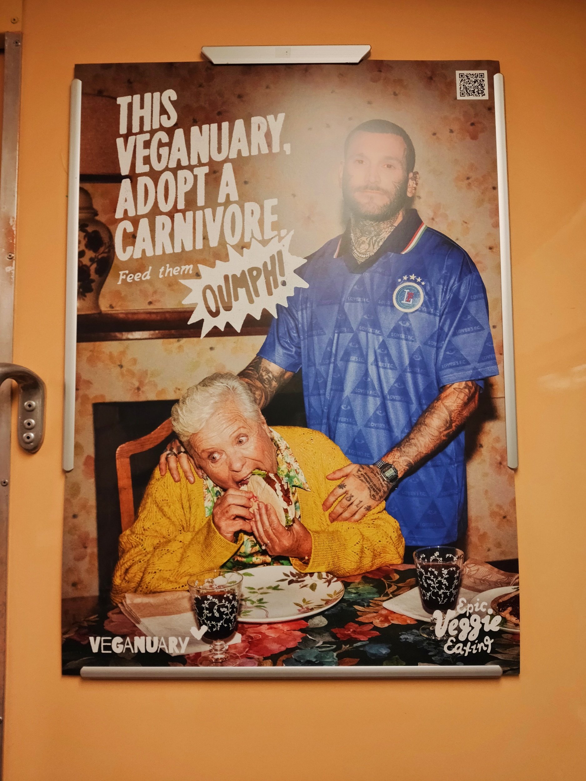「ヴィガニュアリーに肉食人を養子にむかえよう!」と書いてある広告