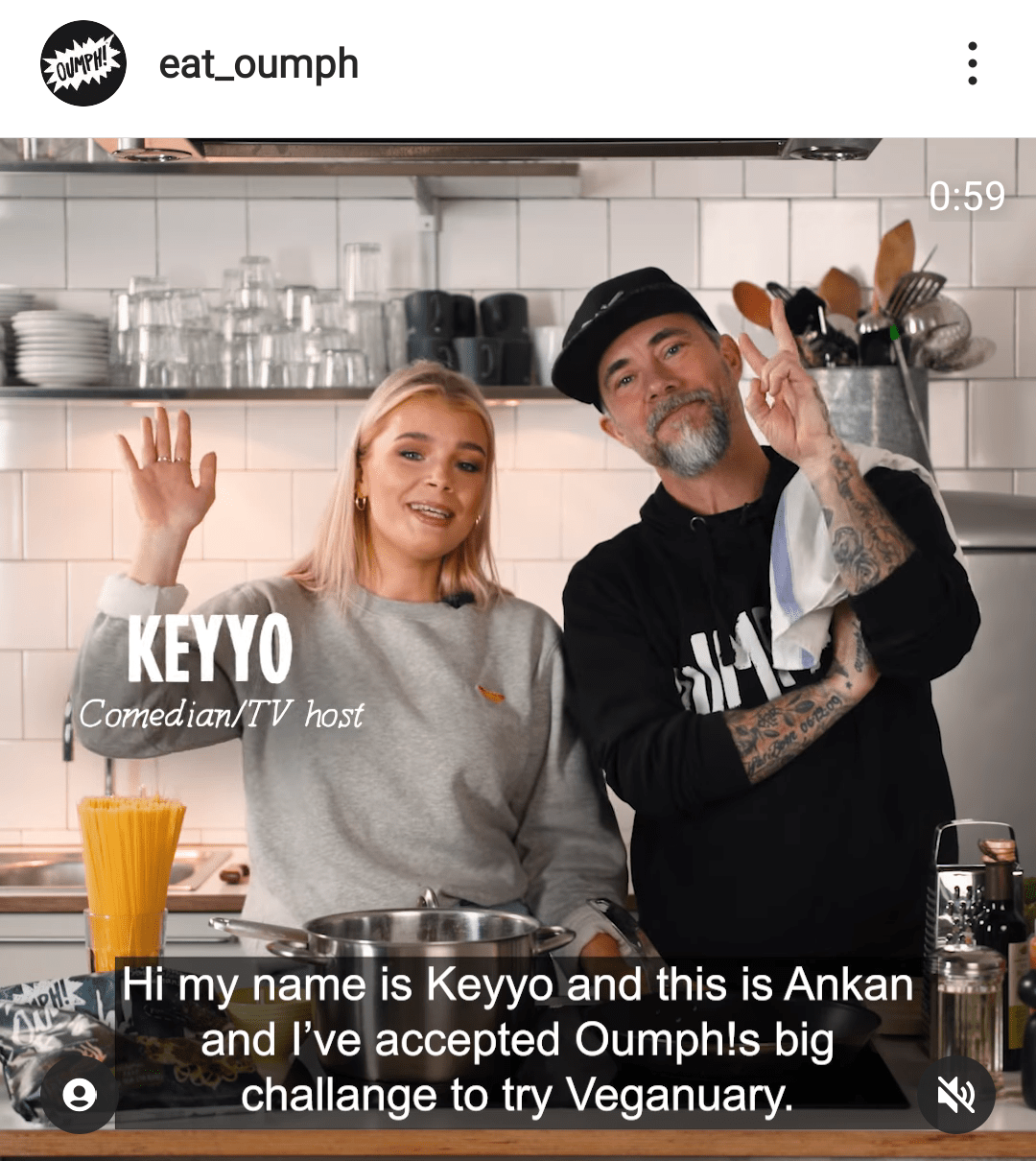 スケーターキャップが似合うタトゥーの入ったヒップな男性発起人が元気な女性人気コメディアンと一緒にインスタやYouTubeの映像で調理方法を紹介してくれてる